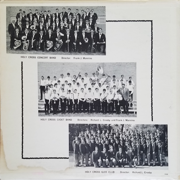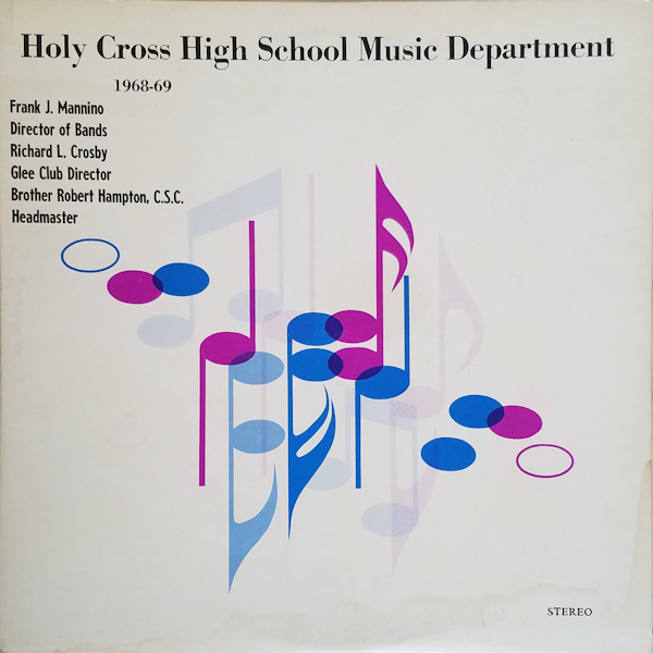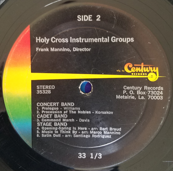 At the conclusion of the Holy Cross 1968-69 school year, “Prof” (together with the Holy Cross Glee Club) produced a vinyl LP recording of the Music Department’s major groups. This included the Holy Cross Tiger Concert Band, Cadet Concert Band, Tiger Stage Band, and Glee Club (vocal singing group). I had the foresight at the time to purchase a copy, which I still own today. While I did not take good care of this LP, which resulted in many scratches being inflicted on the record, nonetheless, this is a very valuable historical artifact for me that contains the only piece of “evidence” that I can direct someone to to appreciate the quality of the organizations under Mr. Mannino’s direction. This is especially true for the Stage Band recording of the 1968-69 group in competition at the Loyola Jazz Competition held each year (at that time) for New Orleans area schools. This group (1968-69 Stage Band) definitely could pass for a professional organization. The precision and tightness of the group is immediately apparent when listening to these recordings.