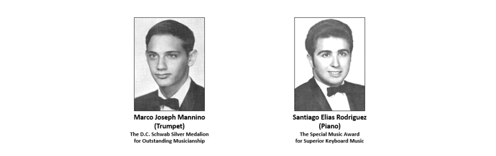 I hold a great deal of respect for fellow students that awarded special recognition for their musical talent. This section duplicates the recognition provided in the Holy Cross yearbooks for graduating years 1969 through 1972. At least two of these, that I know of (Santiago Rodriguez and Michael Genevay) have gone on to develop careers in the music industry. I (re)-present these awards issued by The Holy Cross School, as a sign of my respect for the talent displayed by these fine adolescent musicians.