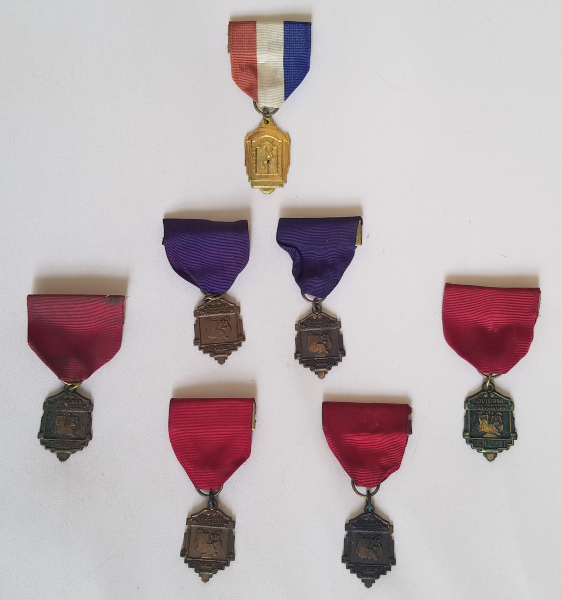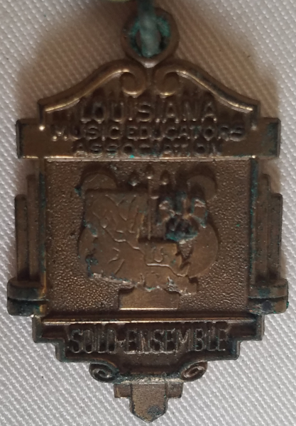 Prof also invited students to participate in Louisiana Music Educators Association (LMEA) sponsored talent competitions for soloists, duets, ensembles, etc. Prof put pressure on me to participate. As an up-and-coming trumpet player in the Music Department of some talent, I obliged, reluctantly, only because I was being strongly encouraged to do so. Standing in front of a panel of judges and playing a solo, then sight reading (playing a piece unseen by my own eyes) was quite intimidating. I believe I started participating in these events in the 9th grade, by playing a solo. I do not recall the pieces I played (I wish I could.) I just recall being extremely nervous about doing so. I did play a duet one year with my fellow trumpet player, and friend, Chuck Sabadie. Again, I do not remember the name of the piece we played. Back then, I believe the LMEA used a rating system of Superior, Excellent, and Satisfactory (they now use a different system.) We were awarded medals of various colors, which are shown here. But I do not know for which events I received these medals, nor for which rating the different medals apply. I am going to guess that purple medals are for Superior ratings, and red medals are for Excellent ratings. The red-white-and-blue medal is probably a participation medal of some kind for some event the band attended, but that memory has long been erased.