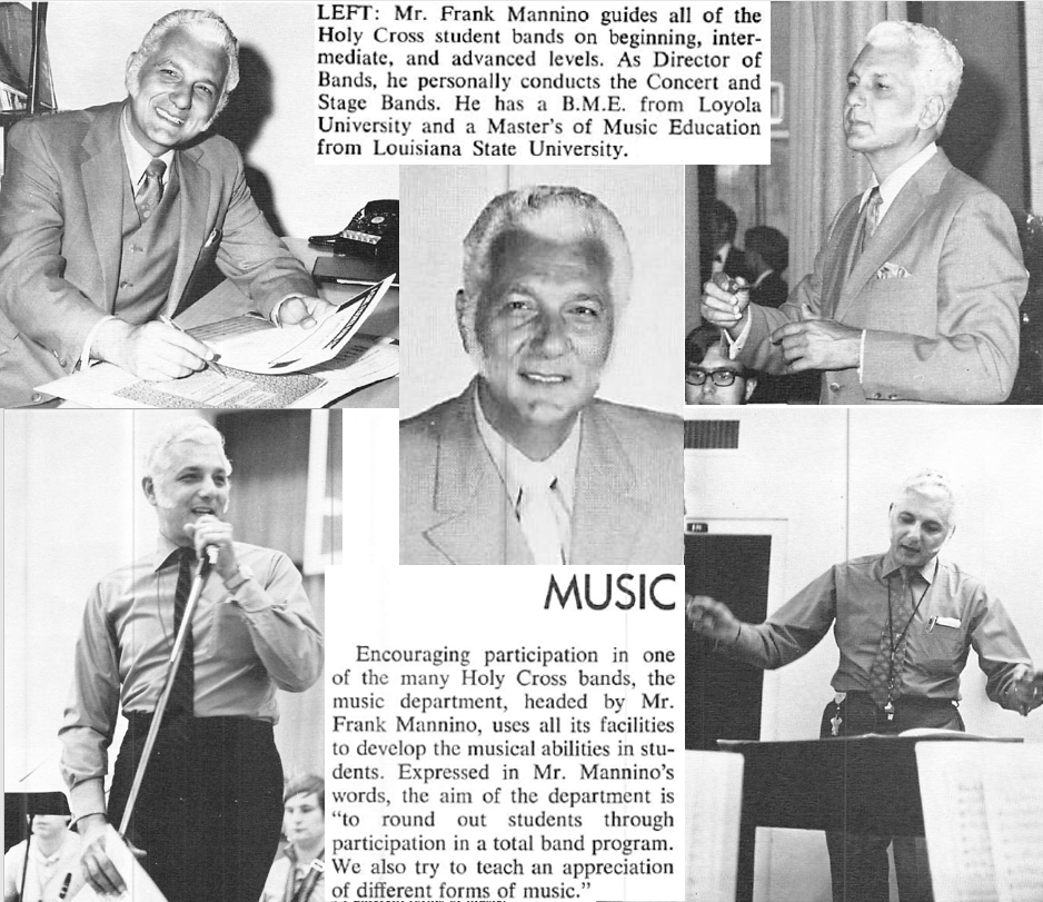 In 1972, the year I graduated from Holy Cross, the yearbook had the following to say about the Music Department programs “Earning superior ratings at all festivals entered, the Tiger bands continued their musical excellence during 1972. Led by Mr. Frank J. Mannino, director of bands, and Mr. Michael Orkus, assistant director, the musicians participated in many concerts, music festivals, and Mardi Gras parades. The Holy Cross bands swept all local and state awards in Louisiana competition, taking superior ratings at the Southeastern, Loyola, and Deep South Festivals.”